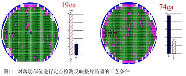 最(zui)終(zhong)的(de)實(shi)驗(yan)證(zheng)明(ming)自(zi)動(dong)工(gong)藝(yi)檢(jian)測(ce)結(jie)果(guo)與(yu)最(zui)終(zhong)良(liang)率(lv)的(de)對(dui)應(ying)關(guan)係(xi)。表(biao)明(ming)自(zi)動(dong)工(gong)藝(yi)檢(jian)測(ce)可(ke)以(yi)反(fan)映(ying)存(cun)儲(chu)單(dan)元(yuan)內(nei)接(jie)觸(chu)孔(kong)通(tong)孔(kong)刻(ke)蝕(shi)的(de)狀(zhuang)態(tai)。對(dui)於(yu)在(zai)生(sheng)產(chan)線(xian)上(shang)檢(jian)驗(yan)到(dao)薄(bo)弱(ruo)部(bu)位(wei)有(you)刻(ke)蝕(shi)不(bu)完(wan)全(quan)比(bi)較(jiao)多(duo)的(de)晶(jing)圓(yuan),其(qi)對(dui)應(ying)的(de)正(zheng)常(chang)存(cun)儲(chu)單(dan)元(yuan)內(nei)也(ye)有(you)較(jiao)多(duo)的(de)接(jie)觸(chu)孔(kong)有(you)刻(ke)蝕(shi)不(bu)完(wan)全(quan)問(wen)題(ti)。可(ke)以(yi)通(tong)過(guo)對(dui)產(chan)品(pin)的(de)薄(bo)弱(ruo)部(bu)位(wei)進(jin)行(xing)監(jian)測(ce)達(da)到(dao)對(dui)正(zheng)常(chang)存(cun)儲(chu)單(dan)元(yuan)內(nei)接(jie)觸(chu)孔(kong)刻(ke)蝕(shi)狀(zhuang)態(tai)的(de)實(shi)時(shi)反(fan)映(ying),這(zhe)對(dui)接(jie)觸(chu)孔(kong)的(de)刻(ke)蝕(shi)工(gong)藝(yi)改(gai)進(jin)有(you)極(ji)大(da)的(de)促(cu)進(jin)作(zuo)用(yong)(如圖11所示)。