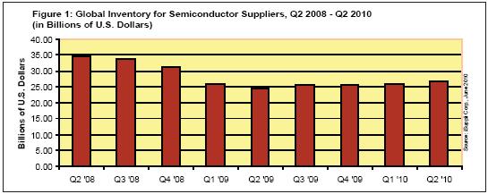 - 2010年第一季度,全球半導體庫存為257.3億美元,僅比上個季度小增1.0%