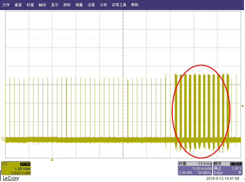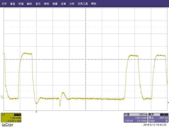 而且這個“飛鳥”和林中的“鳥”相比較很多特點差不多,用什麼邊沿、脈寬、邏輯等觸發還拿它沒辦法;正一籌莫展之際,仔細觀察圖二,終於找到這個“飛鳥”的弱點,正常的波形沒過衝,而數據量突發增大的波形有,不過它跟我們經常見到的出現在波形上方的過衝有點差別(而我們往往習慣於在0軸上方找觸發點、設置觸發電平),它出現在0軸的下麵,正因為這點差點讓它“飛”走了,弱點找到就好辦了,我們把觸發電平設置在0軸下麵的過衝上,並按下normal或single的觸發模式,“鳥兒”很容易就抓到了: