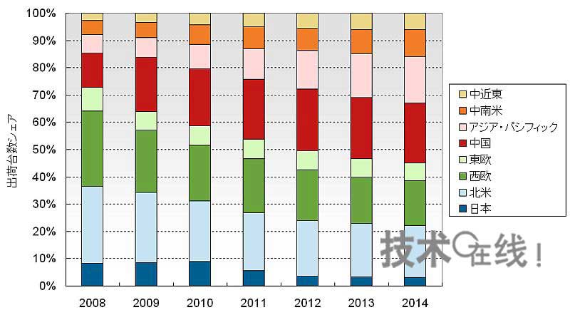 出處:DisplaySearch“中國TV市場調查報告2010年版” 中國市場作為全球電視市場的消費地的地位將會進一步提高。2011年液晶電視供貨量將超過北美,2012年平板電視需求將超過5000萬台(圖1)。