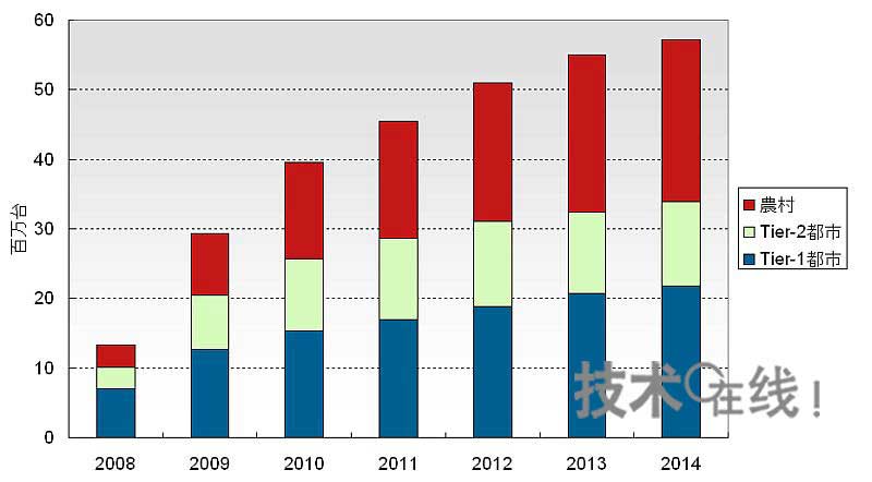 由於中國的城市人口不斷增加,2014年將超過中國人口的一半,達到56%,較10年前增長14%。我們首次將中國的液晶電視需求按照“一線城市”、“二線城市”及“農村”的(de)劃(hua)分(fen)進(jin)行(xing)了(le)預(yu)測(ce)。在(zai)農(nong)村(cun),目(mu)前(qian)正(zheng)在(zai)由(you)顯(xian)像(xiang)管(guan)電(dian)視(shi)向(xiang)平(ping)板(ban)電(dian)視(shi)過(guo)渡(du),一(yi)線(xian)城(cheng)市(shi)和(he)二(er)線(xian)城(cheng)市(shi)每(mei)戶(hu)家(jia)庭(ting)擁(yong)有(you)的(de)電(dian)視(shi)數(shu)量(liang)將(jiang)增(zeng)加(jia)。根(gen)據(ju)經(jing)濟(ji)的(de)增(zeng)長(chang)程(cheng)度(du),電(dian)視(shi)需(xu)求(qiu)甚(shen)至(zhi)有(you)望(wang)超(chao)出(chu)預(yu)測(ce)。我(wo)們(men)預(yu)測(ce),2014年中國液晶電視需求中,城市約占60%,增長至3400萬台左右(圖2)。