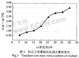 對(dui)於(yu)二(er)步(bu)法(fa)生(sheng)產(chan)工(gong)藝(yi),單(dan)體(ti)為(wei)聚(ju)合(he)反(fan)應(ying)過(guo)程(cheng)中(zhong)的(de)過(guo)量(liang)一(yi)方(fang),聚(ju)合(he)物(wu)生(sheng)成(cheng)的(de)量(liang)由(you)氧(yang)化(hua)劑(ji)的(de)量(liang)來(lai)決(jue)定(ding),聚(ju)合(he)物(wu)在(zai)鉭(tan)芯(xin)表(biao)麵(mian)的(de)沉(chen)積(ji)數(shu)量(liang)隨(sui)氧(yang)化(hua)劑(ji)含(han)量(liang)的(de)增(zeng)加(jia)而(er)增(zeng)加(jia)。從(cong)圖(tu)3可以看出,在相同的浸漬次數下,使用含量為5%的氧化劑陽極塊的質量增加為0.54%,而使用含量為40%的氧化劑陽極塊質量增加為3.52%,因此高含量的氧化劑可以有效增加聚合物的沉積量。