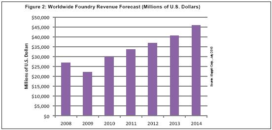 到2014年,總體純晶圓代工產業的營業收入將從2008年的268億美元上升到459億美元,複合年度增長率為9.4%。