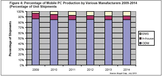 據iSuppli公司,電子製造服務(EMS)提供商將挑戰原始設計製造商(ODM)在移動PC市場中的霸主地位,EMS的出貨量份額預計在2009-2014年上升一倍以上。