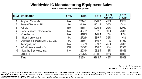 在VLSI 7月初發布的2010年Q1半導體設備公司銷售統計中,中小公司的業績增幅達到了82%。由於SOC測試的增長,Teradyne以46%的季度增幅列前10名設備公司增幅榜首。穩居業界老大寶座的Applied Materials增幅與整個業界持平,為43%。半導體設備Q1的總銷售額達到了104億美元,麵對市場的普遍反彈,業界一片歡呼。相信下周 SEMICON West的party也將成為普天同慶的盛會。