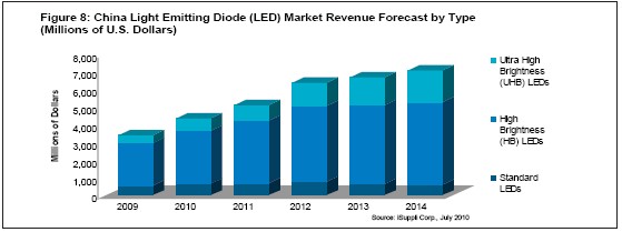 另外,憑借政府的支持和LED日益進入液晶電視及普通照明等新的應用領域,iSuppli公司預測,2014年中國LED營業收入將達到71億美元,而2009年是34億美元,其間的複合年度增長率為12.8%。超高亮度(UHB)LED的增長速度更快,到2014年銷售額將從2010年的6.86億美元上升到18億美元,複合年度增長率為26.9%。