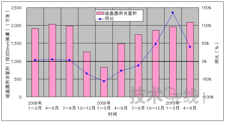 國際半導體製造設備材料協會(SEMI)公布了2010年第二季度(2010年4~6月)的全球半導體用矽(Si)晶圓供貨業績。發布資料顯示,矽晶圓供貨麵積在2009年第一季度(2009年1~3月)觸底後連續五個月增加,突破了2000萬片(按300mm晶圓換算,下同)大關。超過了此前的曆史最高記錄——2008年第二季度(2008年4~6月)的1946萬片,刷新了曆史記錄。