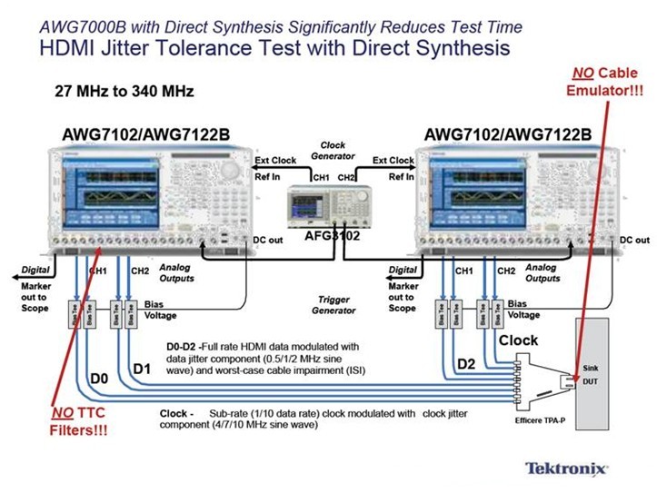 圖2:泰克獨一無二的AWG7000B直接合成方案可替換和省去所有類型的線纜仿真器和多達40個TTC濾波器,大幅降低HDMI接收端抖動容限測試的複雜度,並有效降低成本。