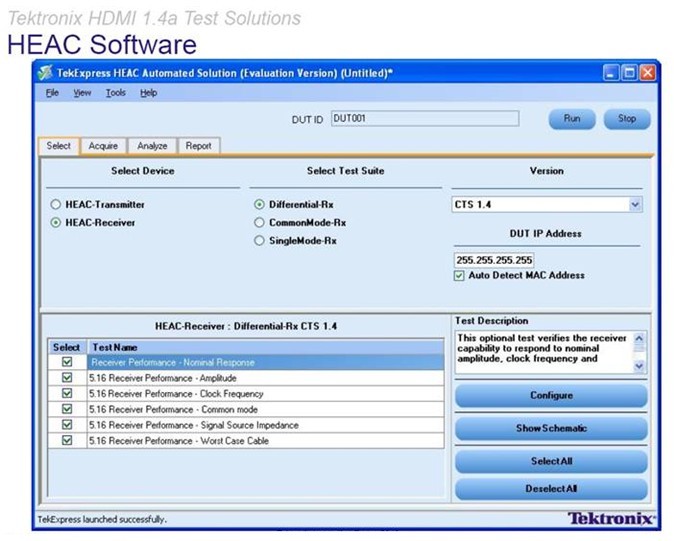 HEAC軟件包含了以太網發送/接收測試軟件,以太網接收測試軟件可控製信號發生器和示波器,設置信號(靈敏度、時鍾頻率、共模抑製、誤碼率),並且提取和檢查相應信號(軟件HYBRID和數據包分析);還包含了音頻發送和接收測試軟件,音頻接收軟件即為任意波形發生軟件(格式支持、模抑製、抖動容限),這樣就不需要分別部署以太網和音頻信號發生器進行組合使用,使測試變得更加簡單,也降低了測試成本。