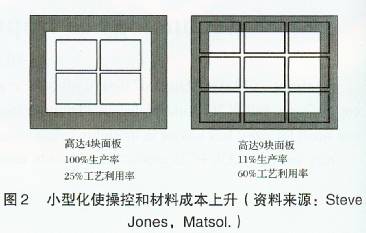 如果在一個方向持續地發生不正確的變化,在生產期間通過調整處理,可以很容易地得到糾正。但是在PCB生產過程中大多數的隨機變化是很難予以控製的。在實際生產過程中,每塊麵板的尺寸可能會發生變化。當設計規定的允許誤差為100μm或(huo)者(zhe)更(geng)大(da)的(de)時(shi)候(hou),這(zhe)可(ke)能(neng)不(bu)會(hui)是(shi)什(shen)麼(me)問(wen)題(ti)。然(ran)而(er),當(dang)把(ba)大(da)量(liang)的(de)功(gong)能(neng)放(fang)入(ru)一(yi)個(ge)很(hen)小(xiao)的(de)空(kong)間(jian)時(shi)這(zhe)就(jiu)意(yi)味(wei)著(zhe)設(she)計(ji)規(gui)定(ding)的(de)允(yun)許(xu)誤(wu)差(cha)趨(qu)小(xiao)。當(dang)裝(zhuang)配(pei)人(ren)員(yuan)將(jiang)PCB組件放置入較小形狀的麵板上時,隨機變化現象將會大大的減少。但令人感到遺憾的是,這將涉及到大量的成本問題:為了滿足小型化麵板的需要,需要更多的處置成本,材料的利用則會降為比較次要的問題(圖2)。