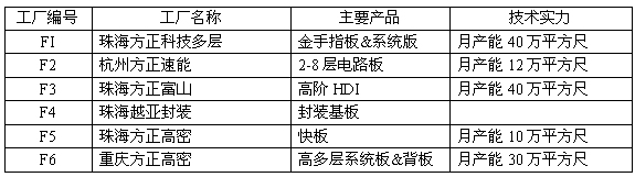 方正電路板1986年成立於珠海,目前擁有六家電路板和一所電路板研究院,產品類型覆蓋快板、高密度互連板、普通多層板(2-40層)、係統板、大型背板、金手指板等,年產能1500萬平方英尺。產品應用於通訊、移動電話、消費電子、醫療電子、工業應用、自動化控製、計算機、航空等領域。