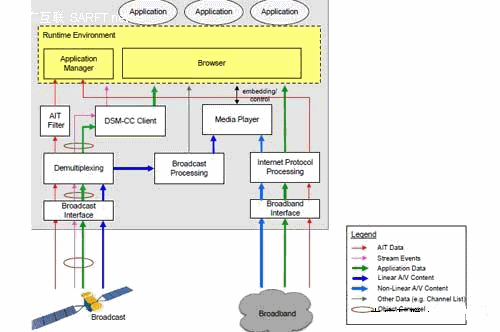 通過寬帶通道(BroadbandInterface),雙模終端能夠連接到互聯網或其它的IP網絡。它提供了應用數據接收的第二個通道,以便與應用提供商的服務器連接。這個連接用於接收非線性音視頻內容(如內容點播業務)。互聯網協議處理器(InternetProtocolProcessing)組件包含了處理來源於互聯網等IP網絡數據的功能,通過這個組件,應用數據提供給運行環境,非線性音視頻內容傳送到媒體播放器(MediaPlayer),包含在應用中解析、呈現與播放。