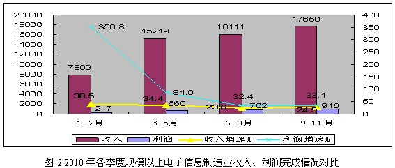 電子信息產業結構調整步伐加快。2010年,電子元器件行業銷售產值分別增長29.4%和39%,出口交貨值增長26.2%和41.7%,利潤 增長61%和207.4%,成為拉動全行業增長的主要力量;軟件產業保持31%的速度增長,占電子信息產業的比重達到18%。產業鏈不斷向上延伸,多條 12英寸集成電路生產線建成投產,與發達國家差距逐步縮小;多條液晶麵板生產線已投產,彌補了高世代生產線的空白。