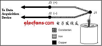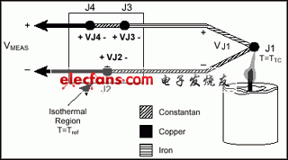 圖3中,J2和J4接點屬於同一類型(銅鎳合金);因為兩者處於等溫環境,J2和J4也是同樣的溫度。因為電路中電流方向緣故,J4端產生一個Seebeck正電壓,J2端產生一個Seebeck負電壓。因此,接點抵消了相互之間的影響,測量電壓的總量就為零。J1和J3接點都是鐵—銅鎳合金接點。但是他們的溫度可能不同,因為他們可能不是在等溫環境中。因為他們處於不同溫度環境下,J1和J3接點都可以產生Seebeck電壓,但是大小不同。為了補償冷端J3,測量其溫度並將其作用電壓從熱電偶測量中減去。