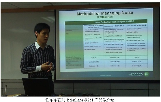 shenghuozaidoushiderenmentongchanghuizaicaozadehuanjingzhongbodahuojietingdianhua,renmenzongshixiwangnenggouxiangzaitianyezhongyibanhuodeqingxibingqiemeiyoushizhendeshengyin。duiyushoujichangshanglaijiang,caiyongnenggouqingxishiquyuyinbingyizhizaoshengdejiejuefanganshiguanjian。weileyingduishangshutiaozhan,ansenmeibandaotituichulegaoxingnengyuyinbuhuoSoC方案BelaSigna-R261。安森美半導體音頻與助聽器中國市場開發經理任軍軍在日前的產品發布會上對BelaSigna-R261的特性做了介紹,並現場對產品進行了演示。