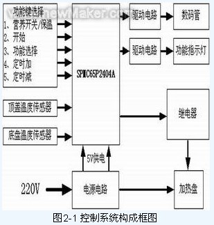 SPMC65P2404A是淩陽公司的8位元單片機,最高工作頻率為8MHz,工作電壓2.5V~5V,有192字節的RAM和4K字節的OTP ROM,有23個可編程IO口,8通道10位A/D轉換器,2通道8位定時/計數器,2通道16位定時/計數器,1個12位PWM輸出口,有低電壓、上電、看門狗、外部信號、錯誤地址複位,並且有一個蜂叫器輸出口……。利用這些資源,能夠實現電飯煲的功能。