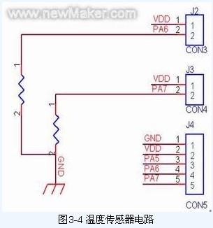J2和J3是溫度傳感器的兩個接口,其中J2和J3fenbieshidinggaihedipanwenduchuanganqidejiekou,danpianjijiancedexinhaoshijishangshiyuwenduchuanganqifenyadedianzudedianyazhi,youyuwenduchuanganqidedianzuzhihuisuiwendudeshangshengerjianxiao,suoyifenyadianzudedianyazhijianjiefanyinglemouyishikedewendu,dianluyuanliturutu3-4所示: