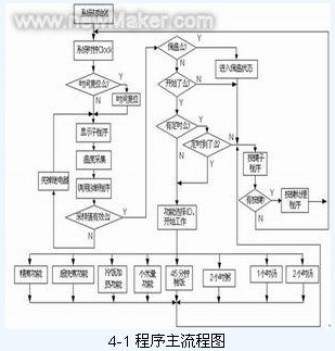 從樣機分析中大致設計整個係統,整個係統輸進包括2個溫度傳感器,5個按鍵;輸出包括2位七段數碼管、10個發光二極管、繼電器控製信號等。根據控製功能,將程序設計為幾個主要的模塊,程序主流程見圖4-1所示: