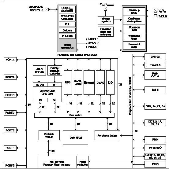 另外,不要忽視那些可能導致嚴重預算問題的膠合邏輯,如看門狗定時器、低電壓檢測、電壓整流器、主時鍾/外設時鍾/實時時鍾等。這些功能的集成,使PIC32 係列成為真正適用於“控製”應用的芯片,有別於“計算機”芯片。