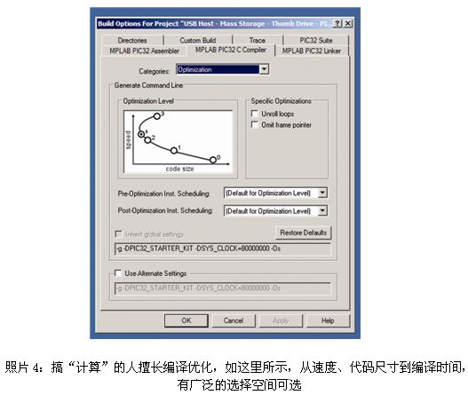需要緊記的是,編譯器優化設置(見照片4)能夠產生很大影響。我試著跑過一個USB主機演示程序,采用了如表1 所示的不同編譯器設置,你可以看到,不同設置下(速度/大小取向、循環展開,采取MIPS-16 的16 位代碼優化選項)生成的代碼大小相差能夠高達2倍。