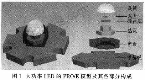 圖1為依據常見1w大功率LED尺寸建立並簡化、海鷗翼封裝鋁熱沉的大功率LED圖形,底座接在MCPCB鋁基板上。主要數據:芯片尺寸為1mm×1mm×O.25mm,透鏡為直徑是13mm的半球。矽襯底為邊長17mm,高0.25mm的正六棱柱,MCPCB為直徑20mm,高1.75mm的六角星形鋁質基板。