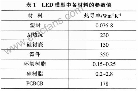 LED輸入功率為1W,光效率取10%;封裝體外部的各組件(包括MCPCB、陶瓷封裝、熱沉的外部)通過與空氣的對流散熱;器件與外界的熱對流係數為20。工作環境溫度為25℃;器件滿足使用ANSYS軟件進行穩態有限元熱分析的條件;最大結溫選擇為125℃。各種材料的參數如表1所示。