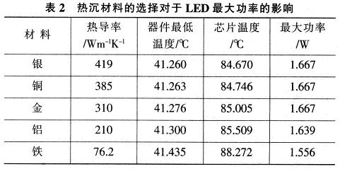 表2給出透鏡熱導率為0.2Wm-1K-1時,不同熱沉材料的導熱係數對於LED最大功率影響。由表2看出,熱沉材料對於LED的最大散熱能力的影響很小。[page]