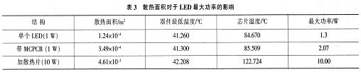 表3為3種不同散熱方式對LED的溫度分布、最大功率的影響。可以看出,增加散熱麵積是很好的散熱方式,可以輕易地提高LED器件散熱能力,這是目前LED產品所普遍使用的散熱方式之一。然而缺點也很明顯:影響成本、增加產品重量、影響封裝密度。無限度地提高LED散熱片麵積顯然不現實,因此一般使用1.5inch2散熱片提升LED產品最大功率至10W左右,出於成本等因素就不能繼續提高。