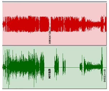在同步過程中,S在170m左右時,在無屏蔽隔阻的情況下出現跑頻現象,再前進約5m就完全沒有信號,參見圖2(下):L有212m左右時進入北門洞,由於屏蔽很嚴重而出現跑頻現象,參見圖2(上)。圖2的時間座標相同,波形中中斷部分為因跑頻而讚成的無接收信號,可以看出。L的接收情況遠好於S。