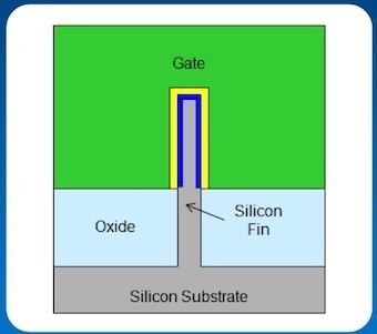 英特爾稱之為3D晶體管,但從技術上講,這是三門晶體管。傳統的二維門由較薄的三維矽鰭所取代,矽鰭由矽基垂直伸出。