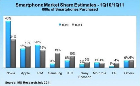 市場研究公司IMS Research表示,在傳統手機市場,三星近年來的表現最為突出。該公司擁有多元化的產品組合,包括使用其自身操作係統bada以及Android和 Windows Mobile操作係統的產品,也包括廣受歡迎的Galaxy係列產品。該公司在智能手機市場的份額從2010年第一季度的3%左右一舉升至2011年第一 季度的13%以上。與此同時,HTC等智能手機廠商的市場份額也大幅上升。