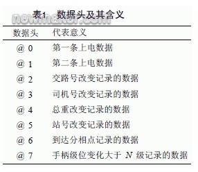 該裝置采用了大容量的存儲器。由於機車運行的數據較多,為了降低GPRS 的使用成本,對於所有采集的信息均采用非分區定長壓縮方法[2]存儲,每包數據定長35 個字節,由數據頭、公共數據、數據幀標識、數據校驗位等4 部分組成。數據頭占一個字節,公共數據占32 個字節,數據幀標識和校驗結果各占一個字節。由於每包數據隻有35 個字節,不能包含所有的機車運行信息,因此在上電的時候將完整的一條機車運行信息拆分成兩包發送。另外,@7 代表的級位變化大小N 的值可以在程序中設定。數據頭及其具體含義如表1 所示。