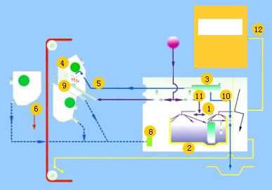 其工藝過程如圖3所示,泵①抽取液槽②的液體或水,通過過濾器③輸送到噴盤架⑤上各種噴盤④中;當平幅運行的織物⑥通過時,液體便噴射其上;末被噴射到織物上的液體則通過回流管⑦流回到液槽;通過預過濾器⑧清除回流液體中的雜質;清洗裝置⑨⑩⑾保證了供液體單元的清洗,控製單元⑿控製整個裝置。