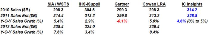 Cowan指出,在這5個最近發布的預測中,有3個都認為2011年該市場的成長仍然會有3,132億~3,134億美元左右; Gartner 較悲觀,預估為2,990億美元;IC Insights 則樂觀地認為會高於3,280億美元。