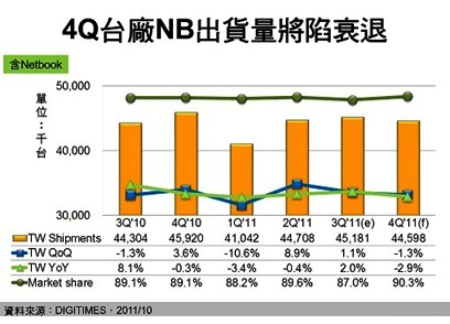 2011年第三季返校商機未顯現,已為後續筆記型(NB)市場買氣不振留下伏筆,DIGITIMES Research 資深分析師兼主任簡佩萍預估,第四季台廠 NB 出貨量將再度陷入較上季衰退局勢,幅度為1.3%。全球NB市場則將衰退更多,為4.8%,單季市場規模恐再度未能達到5,000萬台水準,僅及4,939.7萬台。