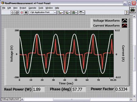 功率損耗的更精確描述可以通過測量設備的真實功率,或“近似功率”獲得,這種測量必須考慮信號的波形和相位。分析真實功率的方法之一是使用兩台同步的PXI-4071 FlexDMM設備,每台都具有采集電壓和電流波形速率高達1.8Ms/s的能力,並提供標準DMM的讀數方式。