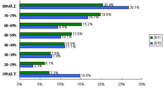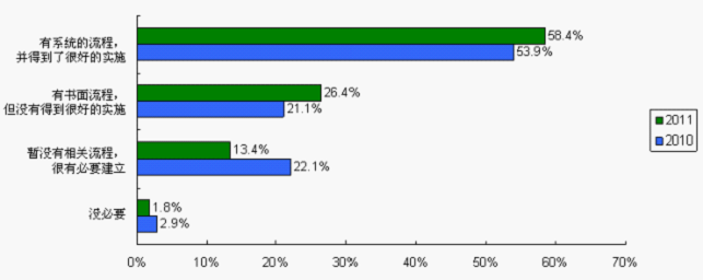 供求雙方把夥伴關係建立在專業評估的基礎上,通過係統流程可以有效減少供應商認證和引入過程中的不合理操作、暗箱操作、防範采購風險、提高采購效率。在供應商認證與引入過程中,沒有建立和認為沒必要建立係統流程的受訪者比例由2010調查的25%(22.1%+2.9%)降至2011調查的15.2%(13.4%+1.8%),已經建立流程並且得到很好實施的比例也由2010調查的53.9%上升至2011調查的58.4%。