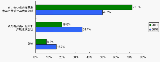 讓rang供gong應ying商shang參can與yu早zao期qi的de產chan品pin設she計ji是shi增zeng進jin供gong求qiu雙shuang方fang夥huo伴ban關guan係xi的de途tu徑jing之zhi一yi,借jie助zhu供gong應ying商shang的de技ji術shu優you勢shi,挖wa掘jue元yuan器qi件jian成cheng本ben空kong間jian,從cong而er提ti高gao產chan品pin競jing爭zheng力li、加快產品上市、降低成本。讓供應商早期參與產品設計與成本分析由2010調查的49.7%大幅上升至2011調查的72%,而其中69.2%是主芯片供應商的參與,30.8%是被動元件供應商的參與。