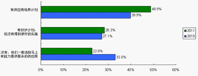 培養供應商有利於建立供求雙方的夥伴關係,提高供應商忠誠度,增強采購風險抵禦能力。有供應商培養計劃的係統廠商由2010調查的39.9%上升至2011調查的48.9%,而沒有計劃的由2010調查的33%降至22.8%。