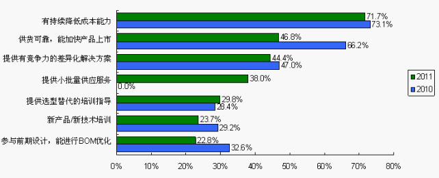 此外,工程師對成本降低持續關注,小批量供應服務成為工程師關注的亮點。隨著市場的企穩,供貨可靠不再變成重大事件。2011中國電子製造商采購行為調查發現,工程師對供貨穩定可靠的期望由2010調查的66.2%大幅降至2011調查的46.8%。