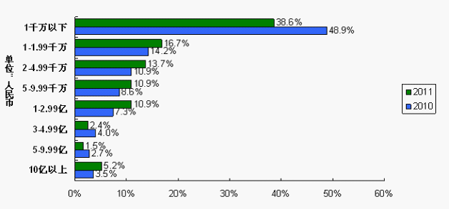 此外,IC和電子元器件的平均采購額由2010調查的1.02億增加至2011調查的1.15億,增加12.7%。采購總額在1億人民幣以上的係統廠商由2010調查的17.5%增加至2011調查的20.1%,大中型企業表現出成長。采購總額在1千萬以下的係統廠商由2010調查的48.9%降至2011調查的38.6%,小微型企業由於經營困難或缺貨衝擊而倒下。