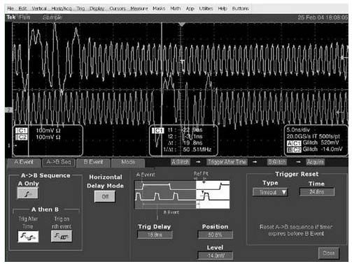 大多數示波器提供了輔助觸發係統或 “B”觸發器,允許用戶定義範圍更寬的條件。B觸發器等待主(褹)觸發發生,然後在越過自己的邊沿門限時觸發采集。這兩者可以結合使用,以設置某些相當複雜的觸發條件。例如,A可能在設備時鍾輸入線路上檢測到一個毛刺,如果在輸出上遇到上升沿或下降沿,可以觸發B。如果沒有這種轉換,那麼毛刺可以忽略。這兩套條件結合使用,可以確定毛刺是否會引起不想要的狀態變化。