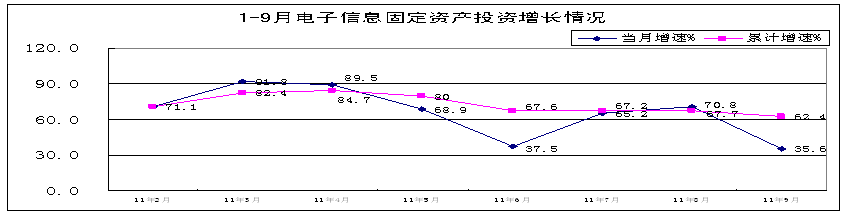 前三季度,電子信息產業500萬元以上項目完成固定資產投資6492億元,投資額超過去年全年水平近500億元,同比增長62.4%,增速高於工業投資35.9個百分點。其中9月份完成投資889.6億元,同比增長35.6%,增速比8月下降35.2個百分點,這是今年以來第二個月月度投資增速低於60%。