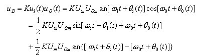 式中的ω0為壓控振蕩器在輸入控製電壓為零或為直流電壓時的振蕩角頻率,稱為電路的固有振蕩角頻率。則模擬乘法器的輸出電壓uD為: