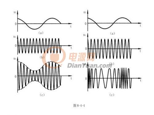 調幅波的特點是頻率與載波信號的頻率相等,幅度隨輸入信號幅度的變化而變化;調頻波的特點是幅度與載波信號的幅度相等,頻率隨輸入信號幅度的變化而變化;調相波的特點是幅度與載波信號的幅度相等,相位隨輸入信號幅度的變化而變化。調幅波和調頻波的示意圖如圖8-4-4所示。