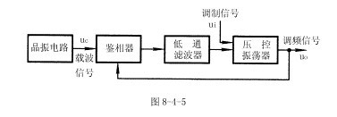 調頻波的特點是頻率隨調製信號幅度的變化而變化。由8-4-6式可知,壓控振蕩器的振蕩頻率取決於輸入電壓的幅度。當載波信號的頻率與鎖相環的固有振蕩頻率ω0相等時,壓控振蕩器輸出信號的頻率將保持ω0不變。若壓控振蕩器的輸入信號除了有鎖相環低通濾波器輸出的信號uc外,還有調製信號ui,則壓控振蕩器輸出信號的頻率就是以ω0為中心,隨調製信號幅度的變化而變化的調頻波信號。由此可得調頻電路可利用鎖相環來組成,由鎖相環組成的調頻電路組成框圖如圖8-4-5所示。