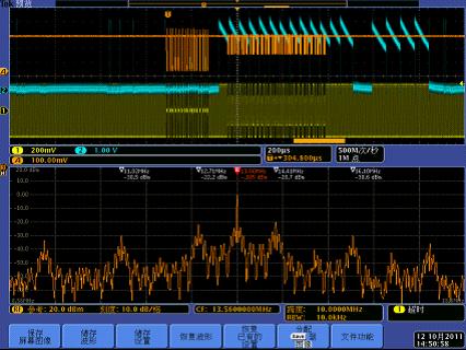 使用ASK調製方式的RFID係統是通過副載波傳輸數據信息的。在上圖的頻譜部分,我們可以清楚地看到射頻信號的載波是13.56MHz,副載波信號為±800KHz左右。符合相關規定的要求。如果需要測量射頻信號的射頻參數,如信道功率、鄰道功率比或占用帶寬等,通過選擇MDO4000的自動測量功能,可以在屏幕中直接顯示這些測量結果。[page]