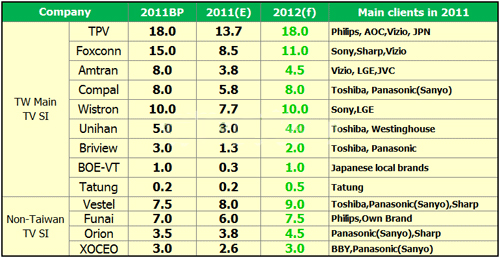 受到品牌需求減少影響,加上部分品牌增加自製比率,台灣代工廠第三季呈現5.2%之衰退,但經過庫存去化及品牌預拉升年底銷售業績影響,預估第四季將有6-9%之成長力道。但整年度看來,TPV(冠捷)還是坐穩第一名,明年如能順利掌控PHILIPS品牌,2012年度計劃有可能朝20百萬台邁進;鴻海(Foxconn)和緯創(Wistron)則受到Sony大幅調降電視需求影響,今年目標恐難以達成,明年成長力道也將受到限製;仁寶(Compal)、永碩(Unihan)、景智(Briview)主要客戶群皆以日本品牌Toshiba(主要為歐日訂單)為主,日震和歐洲經濟困頓,也大大影響其年度績效;瑞軒(Amtran)則受到Vizio波及,整體代工量也未能達標。盡管台灣電視代工廠有Philips、Sony、Toshiba及Vizio等國際品牌及自有品牌的加持,但還是逃不過大環境不佳的衝擊。