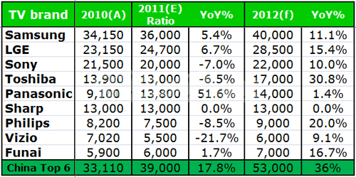 而今年Sharp以日本市場為主軸;Toshiba以日、歐為主要銷售地區,年成長表現衰退;Sony銷售地區橫跨歐、美、日,除了區域性需求不振,加上其組織策略反映較緩慢,不僅財報未見起色,年度液晶電視出貨目標更呈現7%之衰退,下修至20百萬台;Panasonic因購買Sanyo品牌,看似整體市占率提升,但內部獲利壓力頗大,除打算出售位於日本茂原的六代廠,亦將減少8.5代廠的產能,後續仍須觀察;Philips以歐洲為主要市場,難幸免於歐債風暴衝擊;Vizio麵臨與LGD之合作關係生變,加上北美市場不景氣,年度銷售量下滑幅度甚钜;反觀大陸品牌挾帶雄厚資源,年度銷售量成長依舊維持在17~18%左右,市占率更達19~20%,2012更預估有3成之成長力道。