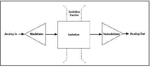 在一個理想的隔離放大器中,其模擬輸出信號與模擬輸入信號完全相同。圖7中標記為“隔離”的部分采用了之前章節中討論的技術(光耦合、電容耦合或感應耦合)之(zhi)一(yi),以(yi)跨(kua)過(guo)隔(ge)離(li)層(ceng)傳(chuan)遞(di)信(xin)號(hao)。調(tiao)製(zhi)器(qi)電(dian)路(lu)為(wei)隔(ge)離(li)電(dian)路(lu)對(dui)信(xin)號(hao)進(jin)行(xing)預(yu)處(chu)理(li)。對(dui)於(yu)光(guang)學(xue)耦(ou)合(he)方(fang)法(fa),您(nin)需(xu)要(yao)對(dui)該(gai)信(xin)號(hao)作(zuo)量(liang)化(hua)處(chu)理(li),或(huo)將(jiang)其(qi)轉(zhuan)換(huan)為(wei)變(bian)化(hua)的(de)光(guang)強(qiang)。對(dui)於(yu)電(dian)容(rong)耦(ou)合(he)方(fang)法(fa)和(he)感(gan)應(ying)耦(ou)合(he)方(fang)法(fa),您(nin)需(xu)要(yao)將(jiang)該(gai)信(xin)號(hao)轉(zhuan)換(huan)為(wei)變(bian)化(hua)的(de)電(dian)場(chang)或(huo)磁(ci)場(chang)。然(ran)後(hou),解(jie)調(tiao)器(qi)電(dian)路(lu)讀(du)入(ru)隔(ge)離(li)電(dian)路(lu)的(de)輸(shu)出(chu),並(bing)將(jiang)其(qi)轉(zhuan)化(hua)回(hui)最(zui)初(chu)的(de)模(mo)擬(ni)信(xin)號(hao)。